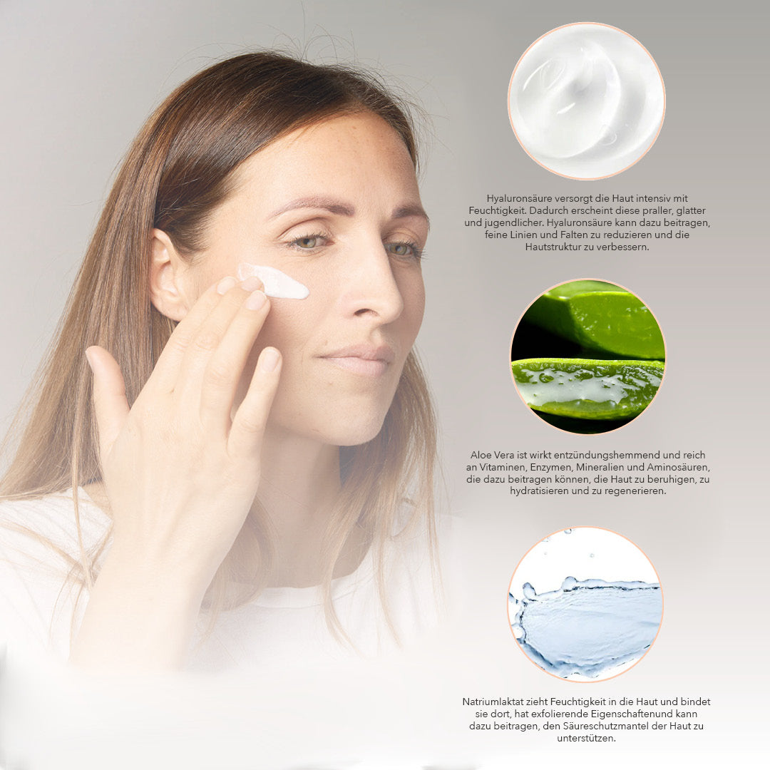 forms the skin's water reservoir and is an endogenous substance (no allergies). It creates a pleasant film on the skin, has an anti-inflammatory effect and strengthens your skin barrier. Hyaluronic acid is stored in the connective tissue, ensures the elasticity and resilience of your skin and has a lasting anti-wrinkle effect.